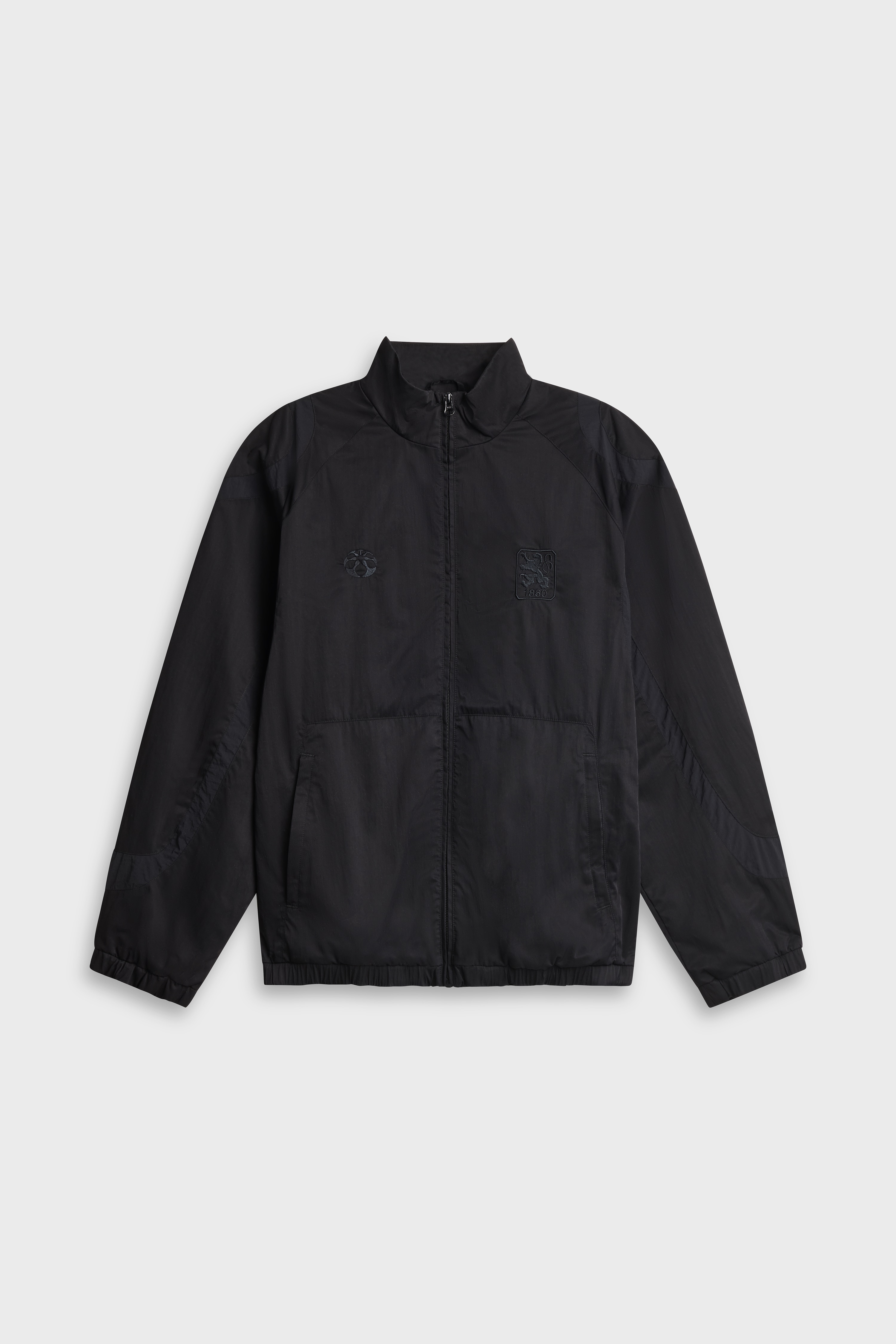 The jacket features an embroidered 1860 logo on the chest and a tonal club name with lion emblem across the back. The pants extend this language with front embroidery, a lion motif on the back, and Societas lettering along the leg. Both pieces are cut in relaxed proportions, finished with elasticated hems and functional zip pockets, and crafted from 100% recycled polyester in Turkey.